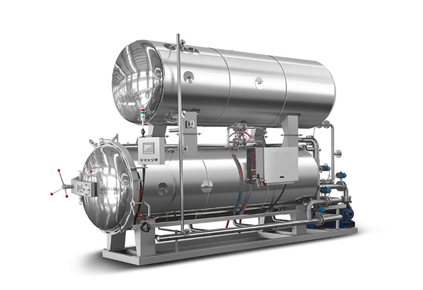 (3)、淋水式殺菌:這類體例是接納噴嘴或噴淋管將熱水噴到食物上,殺菌進程是經由過程裝設在殺菌鍋內兩側或頂部的噴嘴中,放射出霧狀的波浪型熱水至食物外表,以是豈但溫度平均無死角,并且升暖和冷卻速率敏捷,能周全、疾速、不變的對鍋內產物停止殺菌,出格合適軟包裝食物的殺菌。