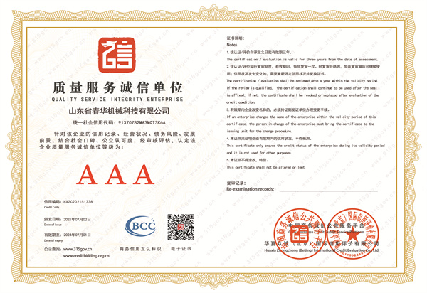 品質辦事誠信單元-企業聲譽-山東省春華機器科技無限公司-山東省春華機器科技無限公司