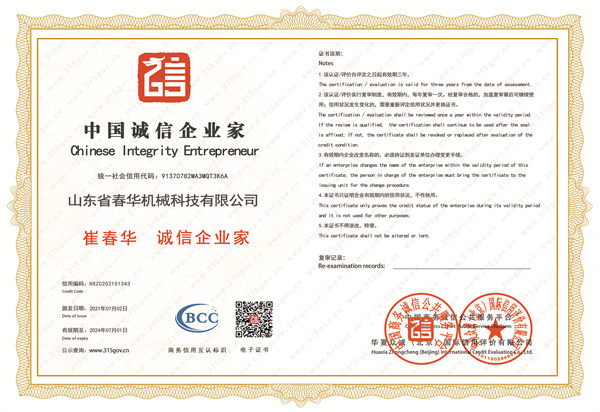 中國誠信企業家-企業聲譽-山東省春華機器科技無限公司-山東省春華機器科技無限公司